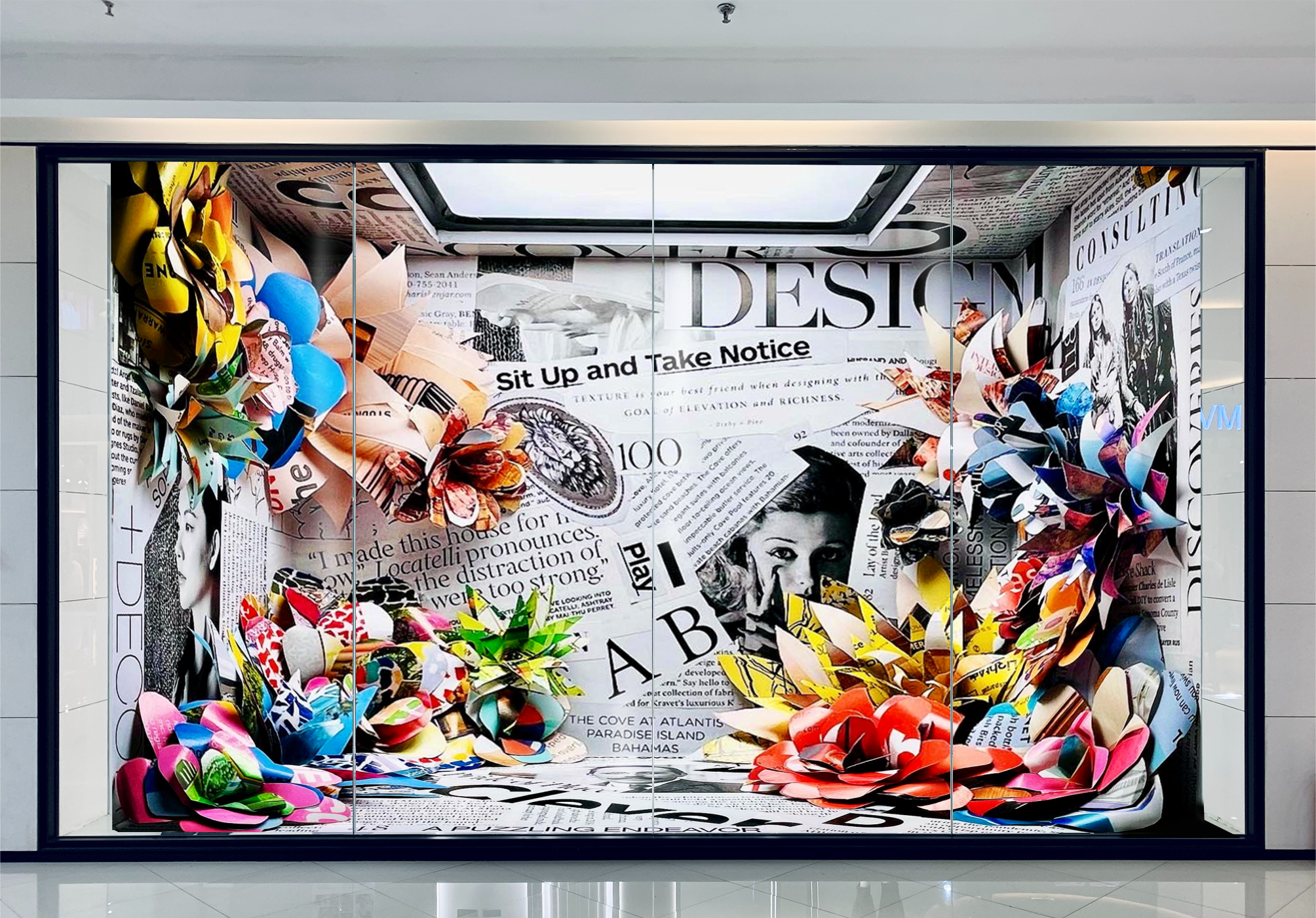 For this project I designed a physical model of a window display. For this I got inspiration from all the scrap pieces of paper and sketches I keep in my bag plus the bright colors that made up my bag. I designed this with no particular product or store in mind but I could see this display working well for Anthropology or Glossier. It could also be a display for simple modern furniture.